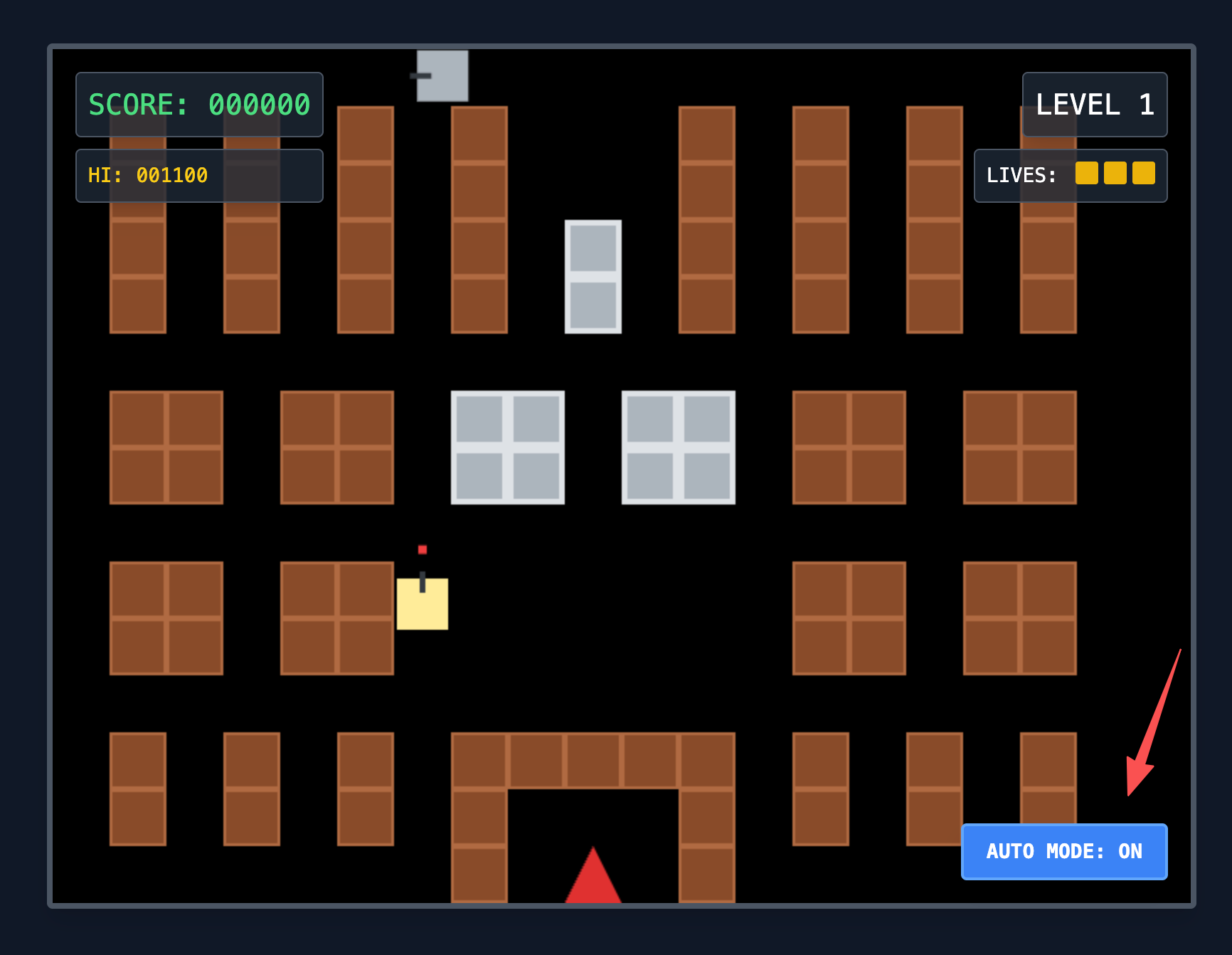 看到上面已经非常完美地复刻了《坦克大战》的游戏,但是考虑到玩家现在都比较懒,能不能做个功能,让AI帮我们玩呢,我们直接看AI对战AI岂不是也是一种乐趣吗,于是让Trae给我加上AI脚本的功能