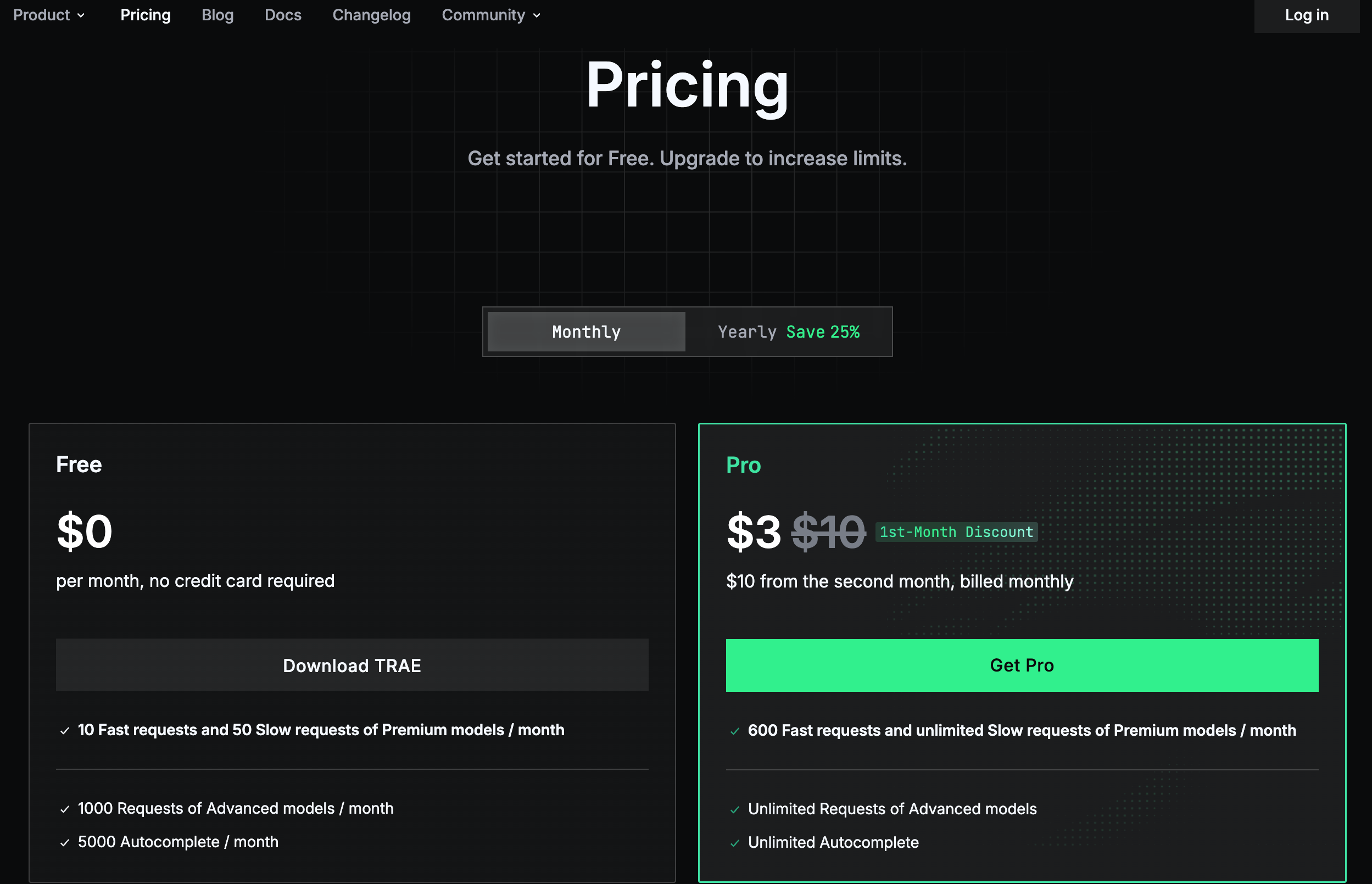 这一步小卷没注意到Trae Solo是Pro会员才有的功能,看了下价钱,首月只需要3美刀,折合下来是21块钱,还算可以,于是开通一个月的会员尝尝鲜
