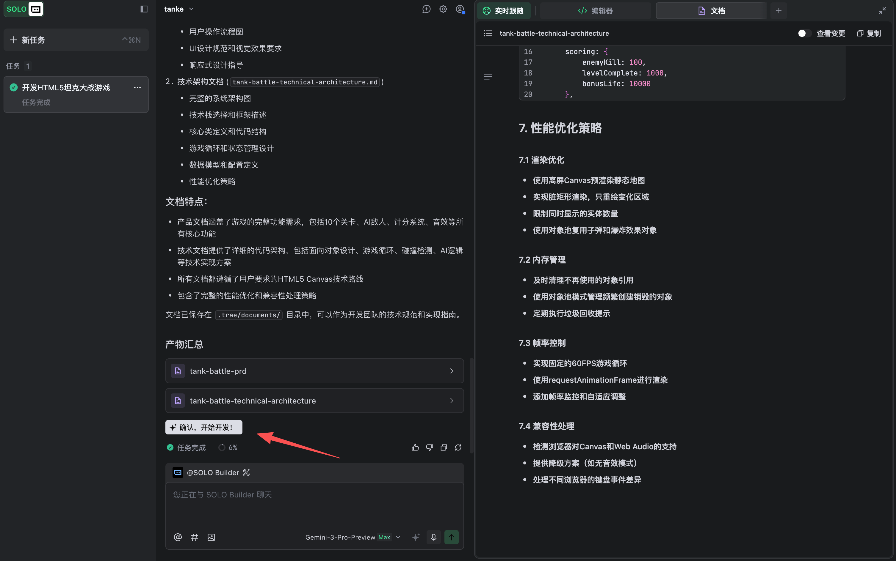Trae SOLO会先生成需求文档和技术架构文档,我们确认没问题之后就可以开始了。有问题可以继续对话让Trae SOLO修改就行