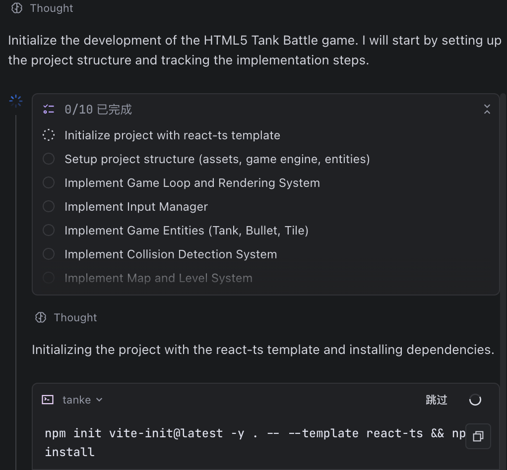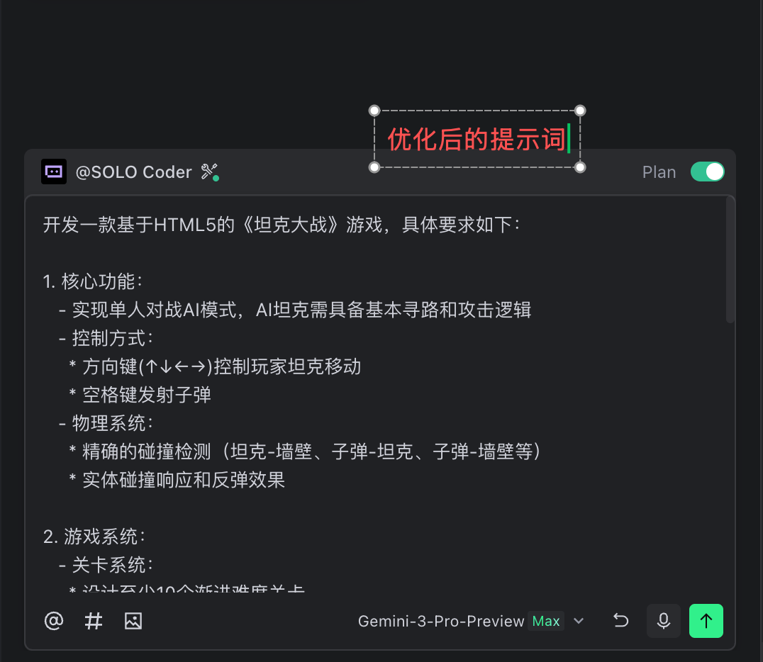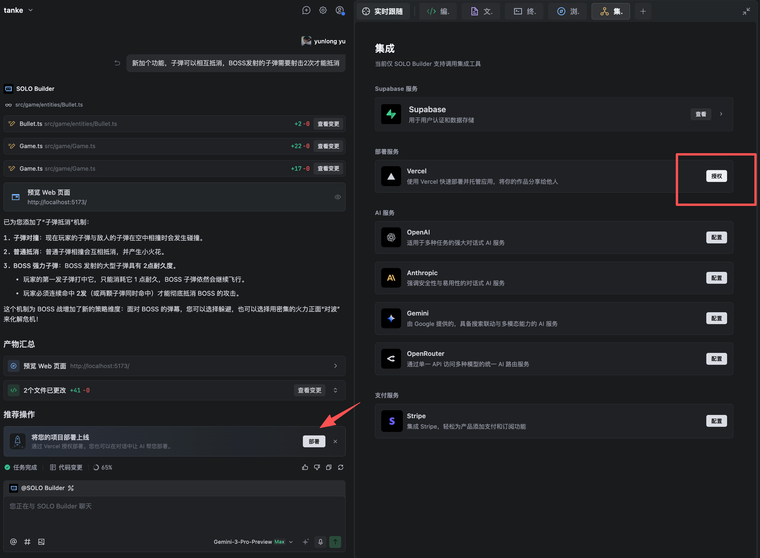 本文演示了如何用AI编程工具Trae Solo快速开发经典游戏《坦克大战》并部署上线。作者通过输入游戏需求,自动生成完整项目代码,实现了单人对战AI、关卡系统、计分等功能。还额外添加了AI自动对战模式、BOSS战等特色玩法。整个过程仅需描述需求,无需编写代码,最终通过Vercel一键部署上线。该案例展示了AI编程工具在提升开发效率方面的强大能力,即使非技术人员也能快速实现创意想法。演示地址:htt