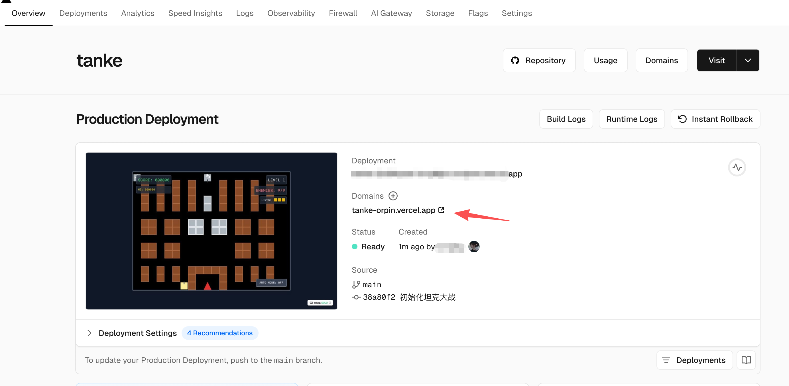 部署完成后,我们打开Vercel的页面,可以看到部署后的域名,直接浏览器打开就能开始玩了