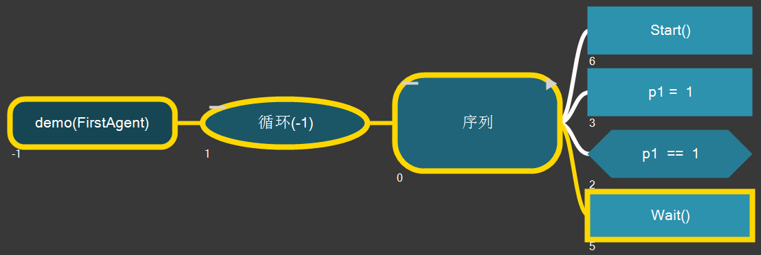 鼠标双击实例节点列表中的节点FirstAgent_0_0,开始跟踪该实例的当前行为树的执行情况,可以看到行为树有了高亮的执行路径效果,表示当前返回Running的所有节点序列,如下图所示:
