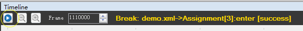 上图中高亮的断点,表示当前行为树的执行已经停在该处。点击Timeline工具栏中的“继续”按钮或直接按F5快捷键,可以继续执行行为树,如下图所示: