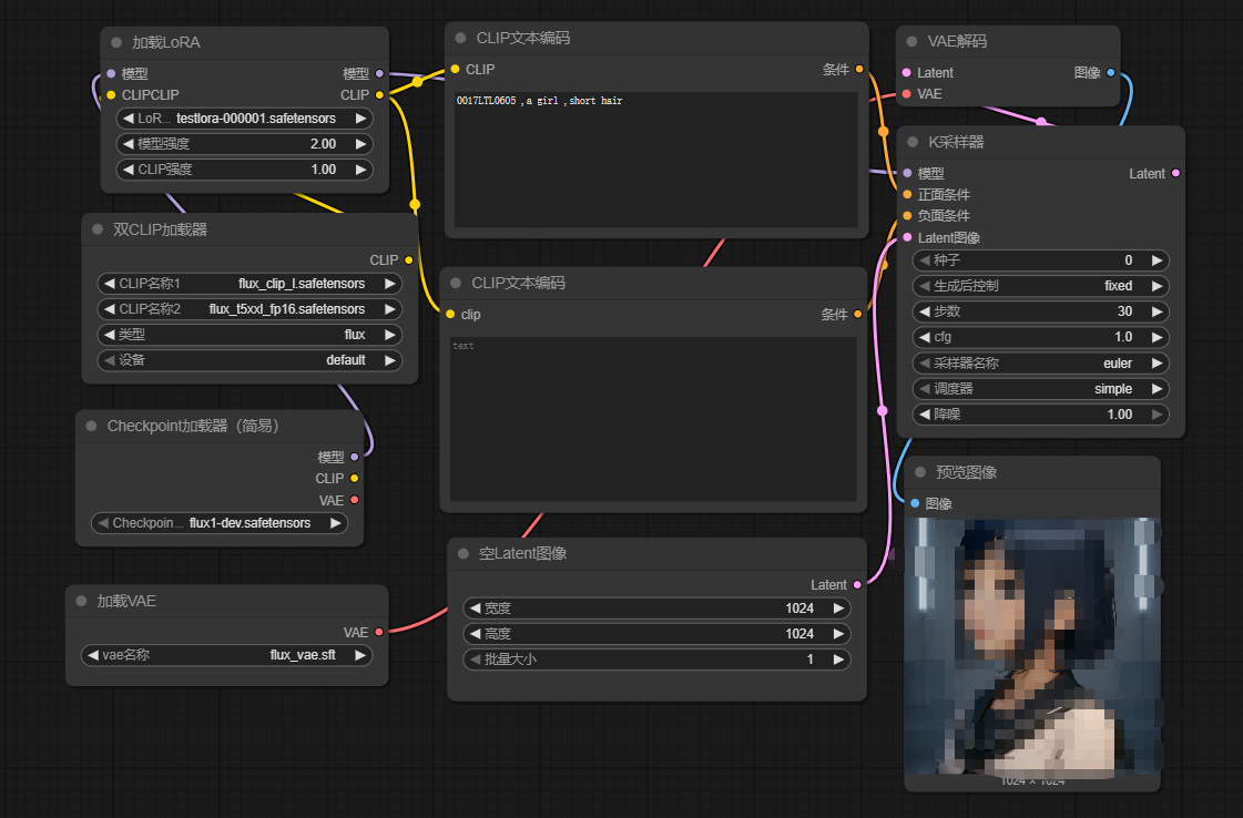 基础工作流即可,加载fluxgym专用clip、vae、主模型。值得注意的是提示词一定要输入你在Trigger word/sentence设置的触发词,可去更改其他提示词验证LoRA效果。