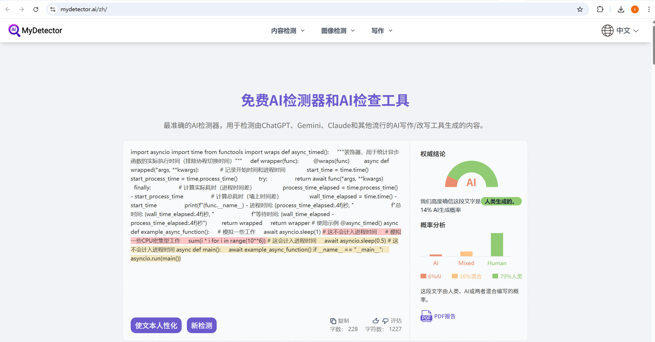 把改过的稿子再放到 mydetector.ai 上测一遍。