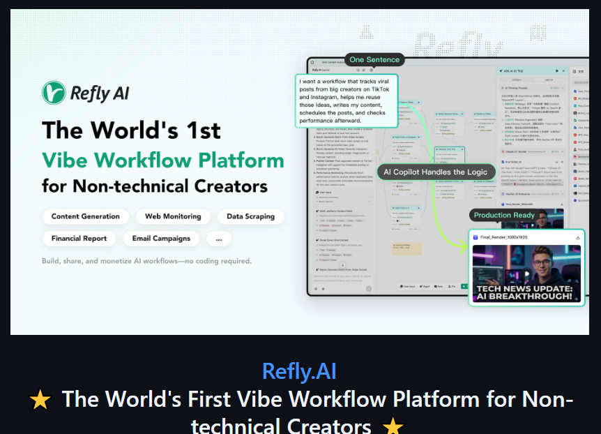 Refly.AI 是全球首个主打“氛围工作流(Vibe Workflow)”的平台,用 提示词 + 可视化画布 + 模块化拖拽 的方式,让非技术用户无需写代码,就能构建、分享并变现 AI 自动化流程。它像是 非技术人员的 n8n,也是 工作流领域的 Canva。