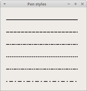 我们创建一个QPen对象。颜色是黑色的。宽度设置为2像素,以便我们可以看到笔样式之间的差异。Qt.SolidLine是预定义的笔样式之一。