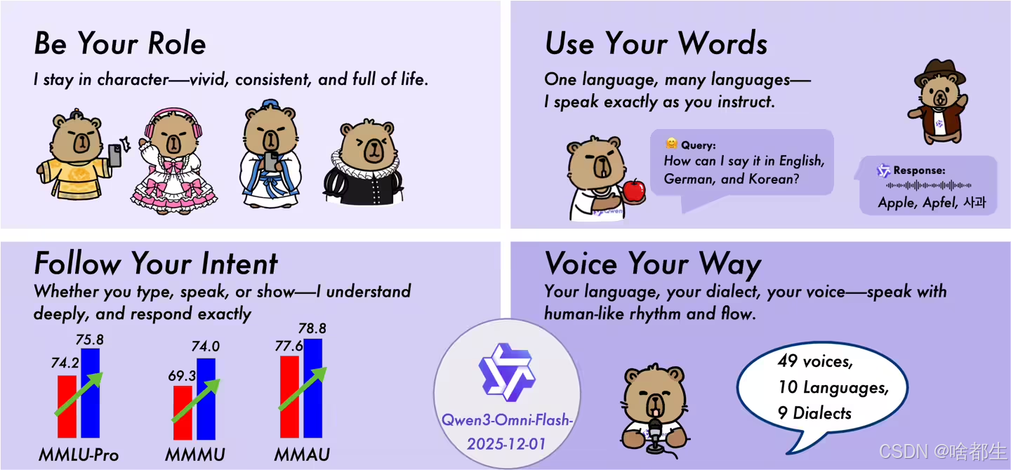 阿里Qwen团队推出Qwen3-Omni-Flash-2025-12-01,作为Qwen3-Omni的全面升级版,支持文本、图像、音视频无缝输入与实时流式输出,语音生成自然度逼近真人,显著改善语速、停顿与韵律。模型开放System Prompt自定义权限,可精准设定“甜妹”“御姐”“日系”等人设风格及回复偏好。多语言方面,支持119种文本语言、19种语音识别语言和10种语音合成语言。在ZebraLogic逻辑推理、LiveCodeBench-v6代码生成和MMMU多学科视觉问答三项基准上分别提升5.6、9.3和4.7分