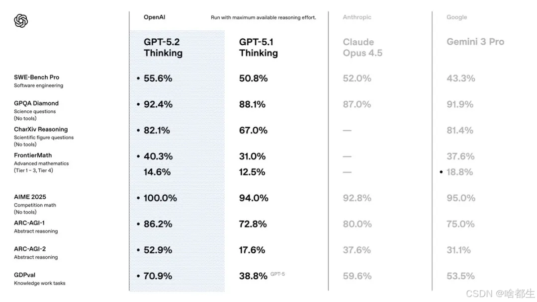 OpenAI正式推出GPT-5.2大模型,提供Instant、Thinking和Pro三个版本,分别面向常规任务、复杂结构化工作和高可靠性需求场景。其中GPT-5.2 Thinking在涵盖美国GDP前九大行业的44项职业知识任务(GDPval测试)中,70.9%的表现达到或超过人类专家水平;在SWE-Bench Pro软件工程评测中准确率达55.6%,SWE-bench Verified更高达80%。模型幻觉率较GPT-5.1降低约30%,长文本推理在256K上下文的MRCRv2“4针测试”中接近100%准确率;视觉理解错误率下降约50%,Tau2-bench Telecom工具调用得分98.7%。数学方面,在ARC-AGI-1测试中Pro版准确率突破90%,并在FrontierMath和GPQA Diamond等高阶科学任务中显著提升。GPT-5.2已向ChatGPT付费用户开放,API同步上线,GPT-5.1将在三个月后下线