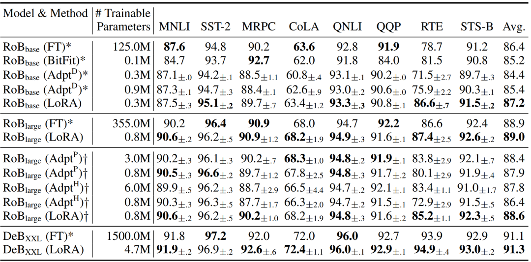 下表展示了不同的方法对、和模型进行微调后,在GLUE基准测试上的得分。所有测试得分都是越高越好。