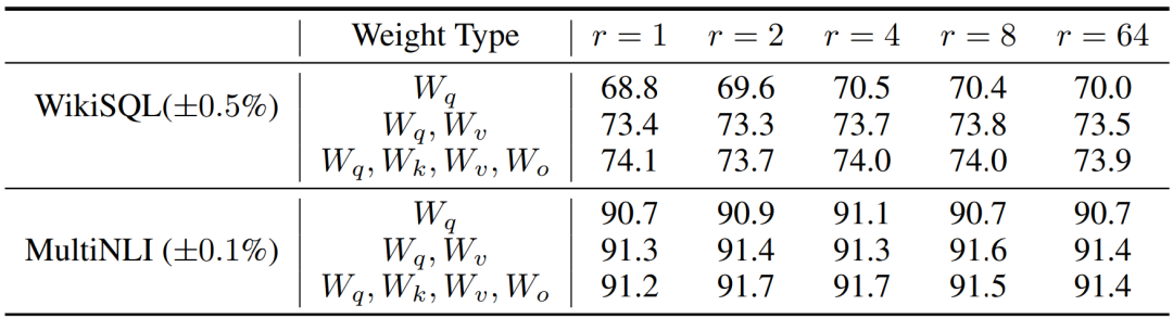 (4)这意味着,即便只用大小为2的秩,在所有矩阵上进行适配也可以从▲W中获得足够多的信息。