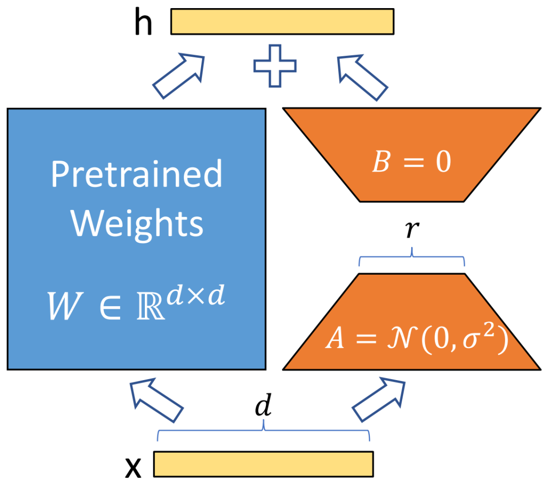 - 矩阵尺寸规范:矩阵B为d×r,矩阵A为r×k,最终输出形状为d×k。其中r通常取值为8/16/32/64等较小数值。