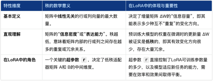秩是衡量矩阵中真正有效信息量的数学指标,而LoRA技术正是巧妙地利用了权重矩阵的“低秩”特性来实现高效微调。