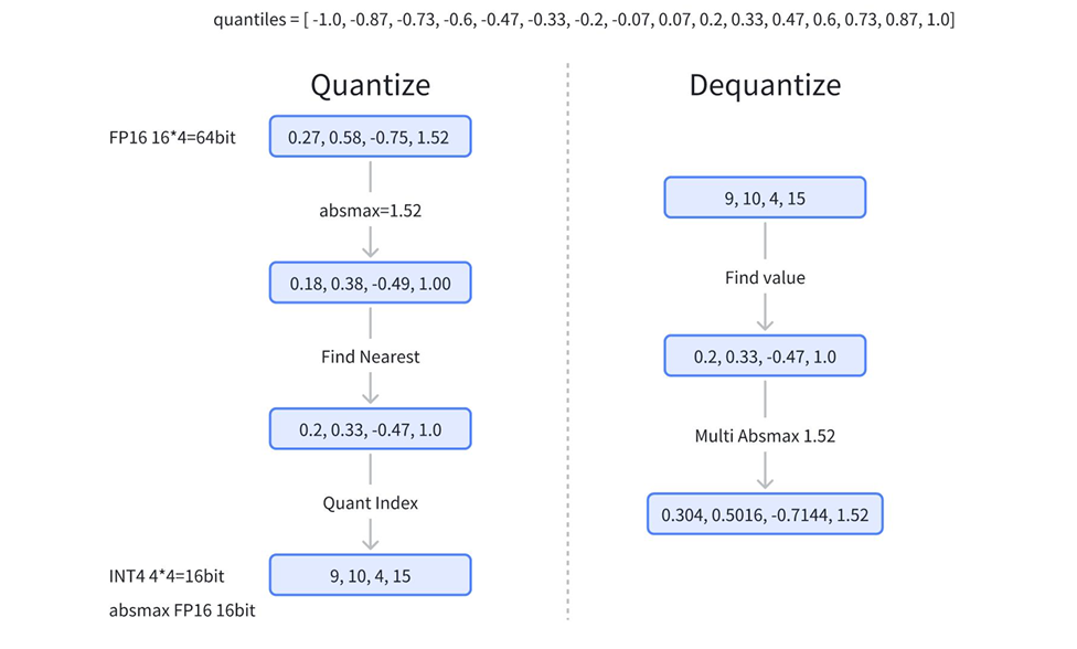 具体来说就是每64个参数共享一个量化常数(Absmax,32bit),这样的话相当于每一个参数的量化额外开销为32bit/64=0.5bit。