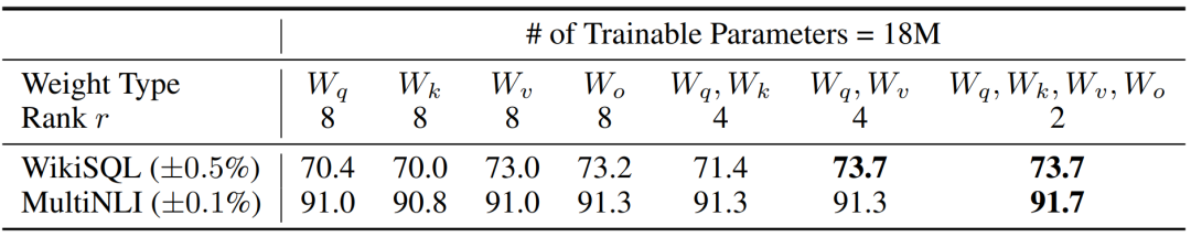 下表展示了当微调参数预算固定为18M(参数的个数,如果以FP16存储则占用空间约为35MB)时,在GPT-3 175B预训练模型上,对不同的注意力权重矩阵进行LoRA适配后,在WikiSQL和MultiNLI任务上测试的准确率。