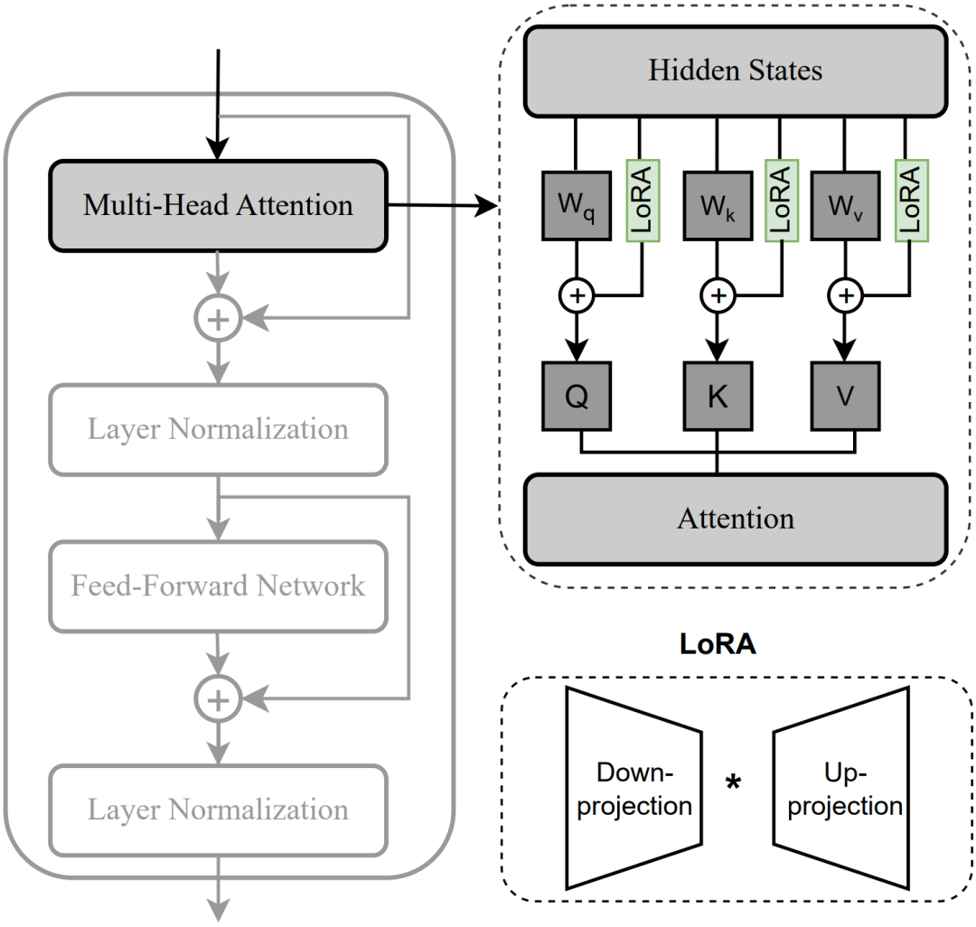 上文提到,研究团队只对自注意力模块应用LoRA适配,其中包含四个权重矩阵W_q, W_k, Q_v, W_o。