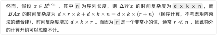 LoRA将▲W替换为BA_x,参数量由d x k替换为d x r + r x k,在r << min(d,k) 时参数量显著减少。以r = 2为例,参数量变为,空间复杂度显著降低。