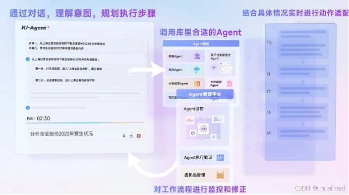 金智维的核心竞争力在于“流程级智能体”与 RPA 深度融合。其 Ki-AgentS 等产品将大模型的认知规划能力与执行层的自动化引擎结合,使智能体不仅能“判断”,还能在既定规则下“执行并闭环”。这种以“数字员工”形式嵌入贷前审核、流水分析、报送与质检等高重复、高合规模块的做法,更贴合银行对稳定性、可审计性与运维可控性的实际要求。