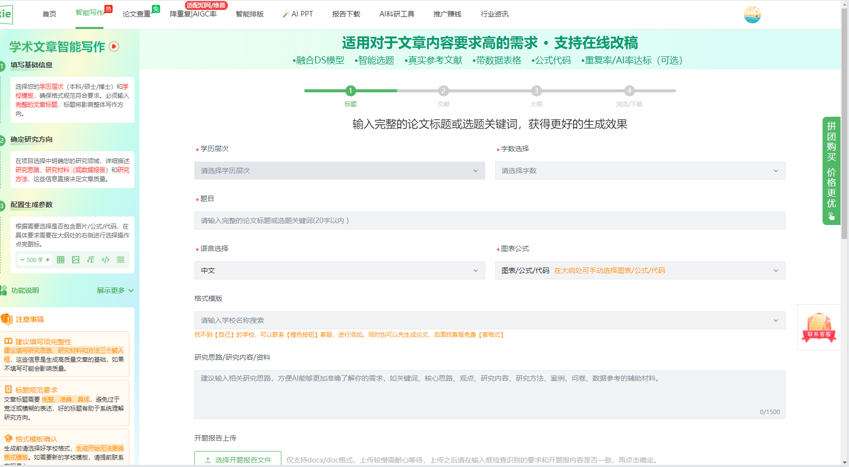 - 研究方向与内容输入: 仅仅输入一个标题是远远不够的。PaperXie鼓励用户详细描述“研究思路、研究材料(或数据报告)和研究方法”。这是一个关键的“知识注入”过程。系统通过这些信息,能够更准确地理解你的研究背景和核心诉求,从而生成更具针对性的内容。例如,如果你的研究涉及“深度强化学习”,系统会倾向于调用相关领域的术语和经典模型框架。