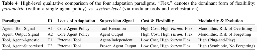 综述构建了一个包含四个象限的系统性框架,根据被优化的对象是智能体还是工具,以及优化信号是来自工具执行结果还是智能体自身的输出来划分。