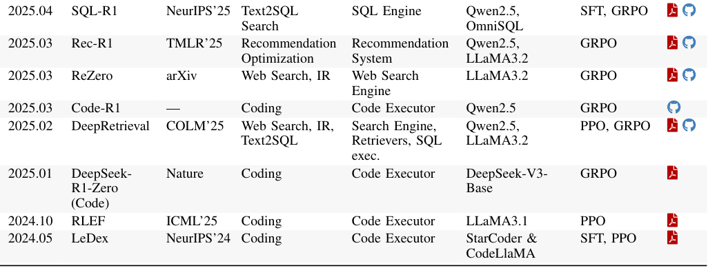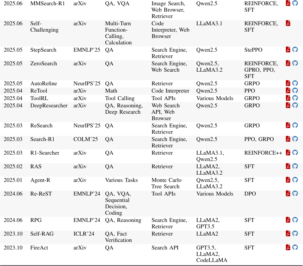 Search-R1和ReSearch是这一领域的杰作。在这些系统中,模型需要自主决定何时搜索、搜索什么以及如何利用搜索结果。训练的奖励信号不关心某一次具体的搜索是否完美,只关心最终生成的答案是否正确。