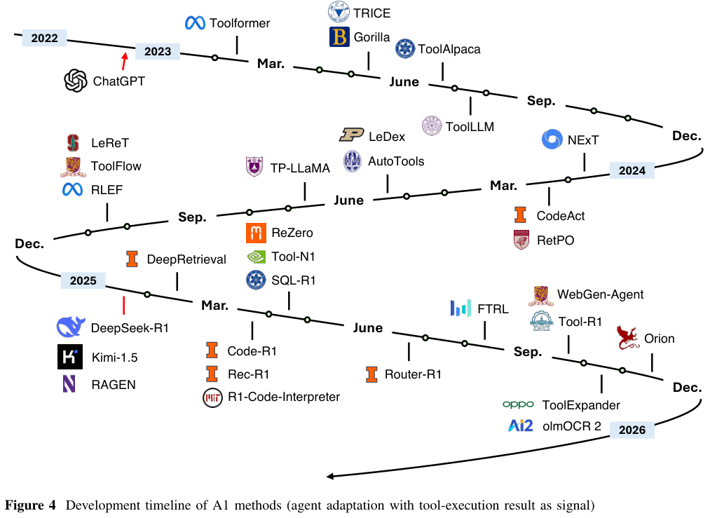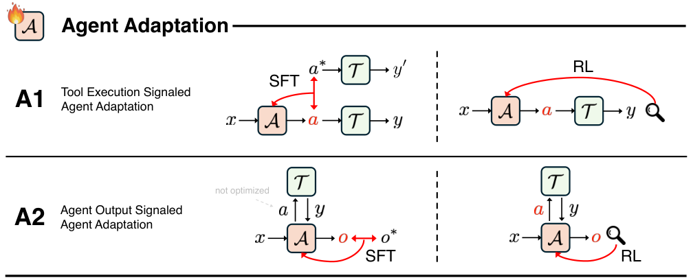 在智能体适应性的版图中,最直观的路径是直接改造智能体本身,使其更擅长使用工具或进行推理。