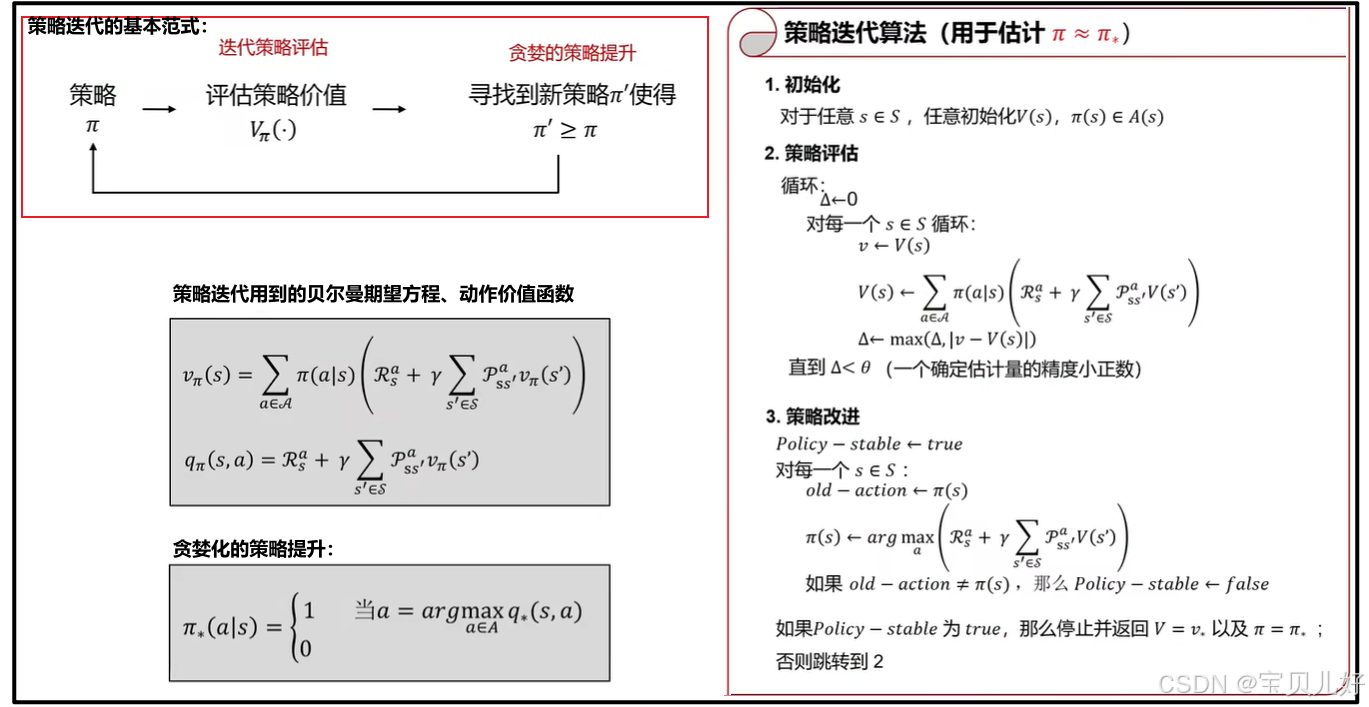 至此我们就得到策略迭代的基本范式、计算公式、算法实现: