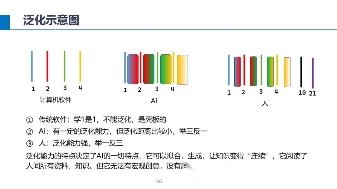 AI的泛化能力解决了很多问题,没有泛化能力几乎很难图像识别,稍微变形和角度它就不认识了。没有泛化能力,AI无法写代码,只能查找代码。没有泛化能力,它无法生成内容,无法写摘要,也无法看懂一个疾病诊断报告。泛化能力极大的拓展了计算机应用空间。