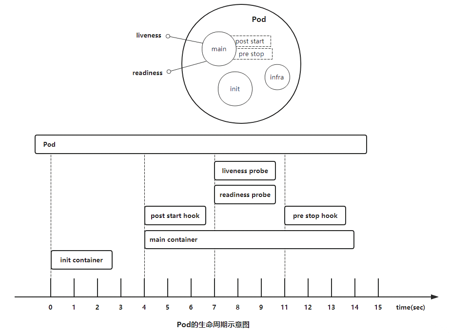 从上面这张图我们可以直观的看到PostStart和PreStop包括liveness和readiness是属于主容器的生命周期范围内的,而Init Container是独立于主容器之外的,当然他们都属于Pod的生命周期范畴之内的。