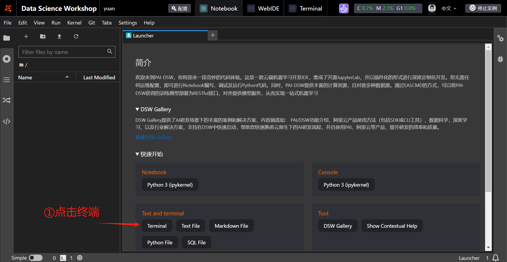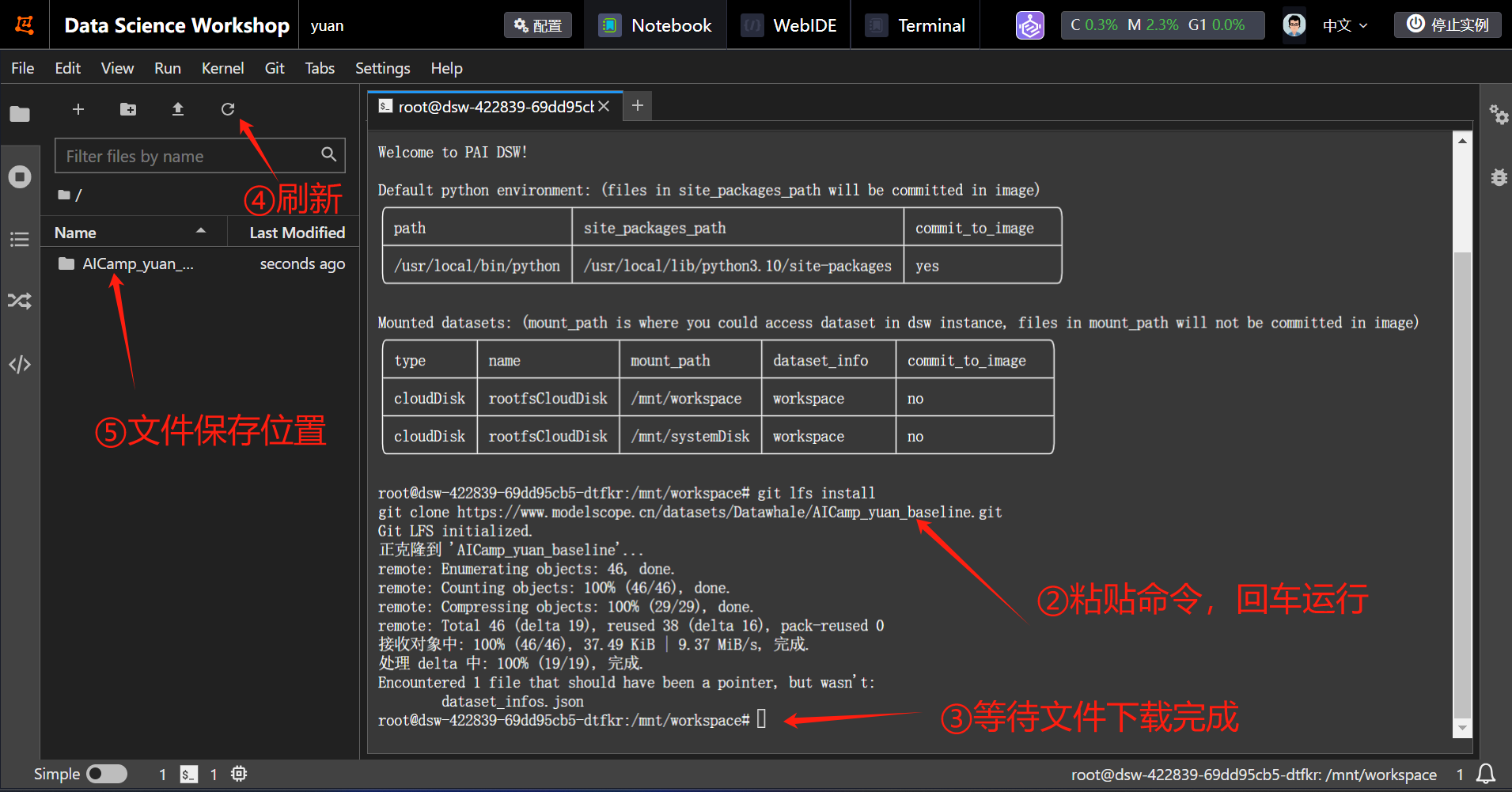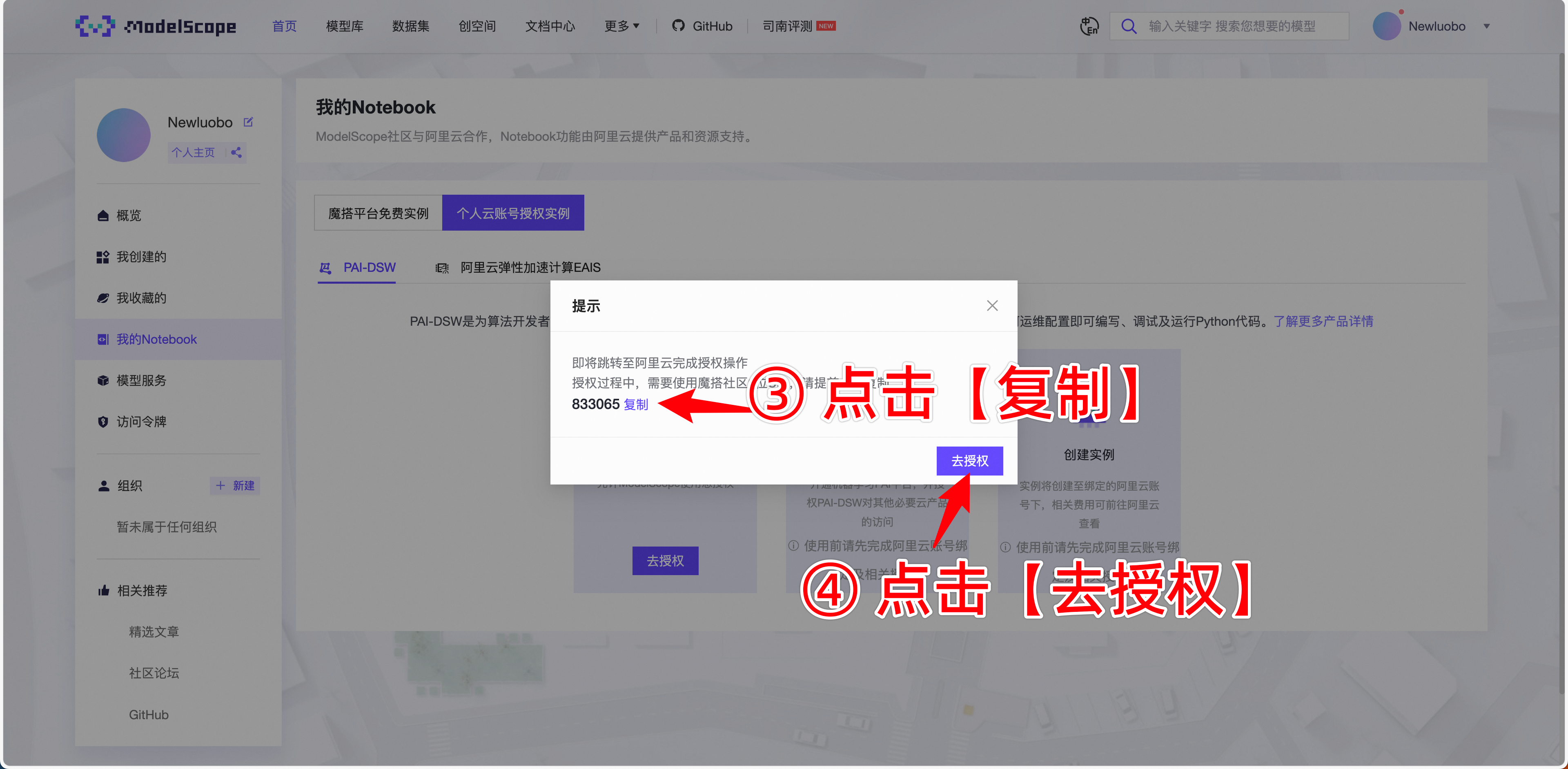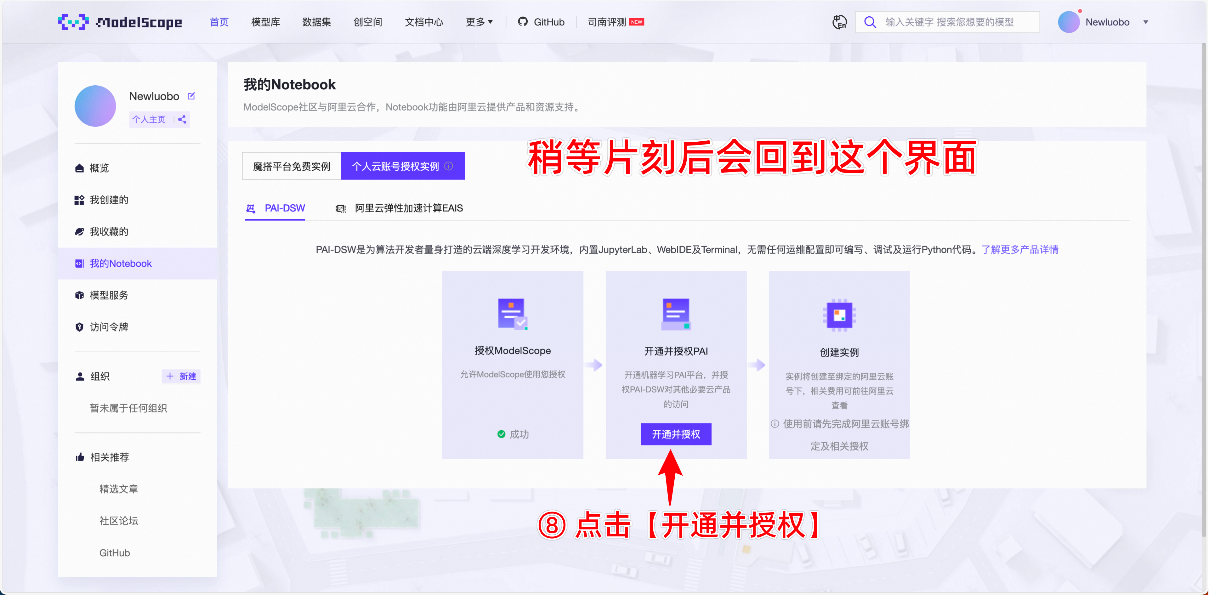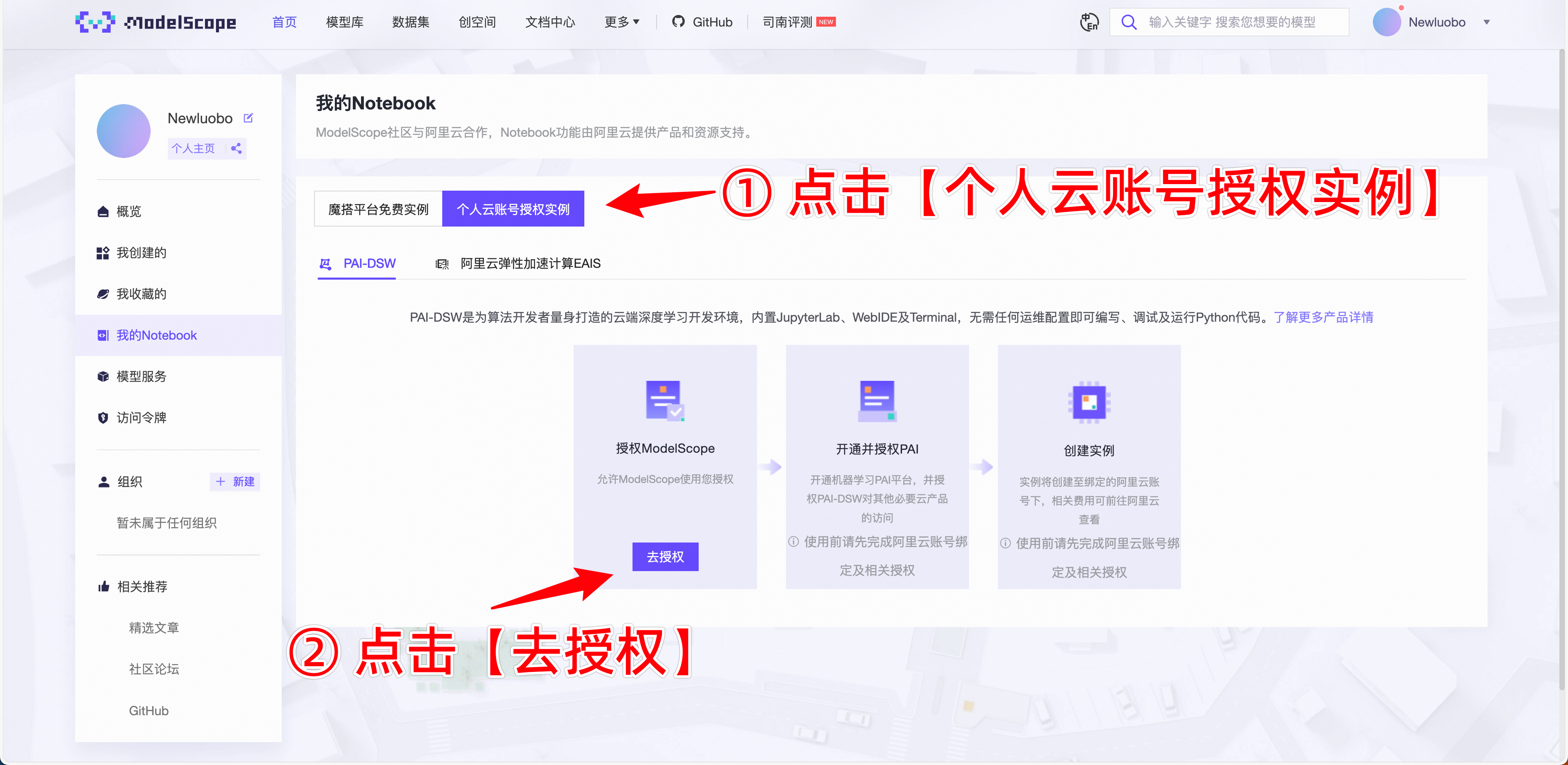 2.进入如下链接(新用户先注册,然后绑定阿里云账号,还需要完成阿里云账号的实名认证,直接完成即可)然后到个人主页,找到我的Notebook,按下图片指引操作。