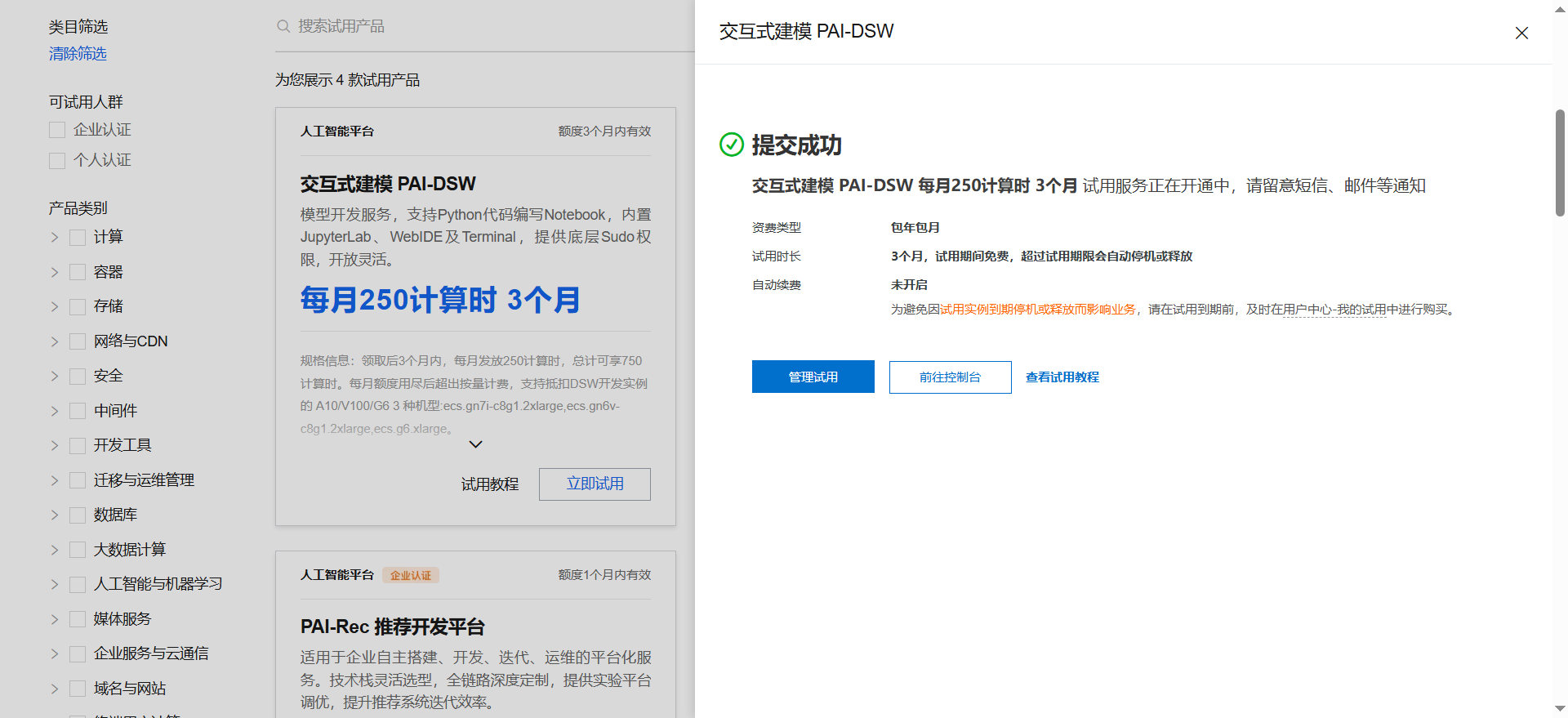 1.进入如下链接,登录,找到交互式建模PAI-DSW(每月250计算时3个月进行租用。如下图。