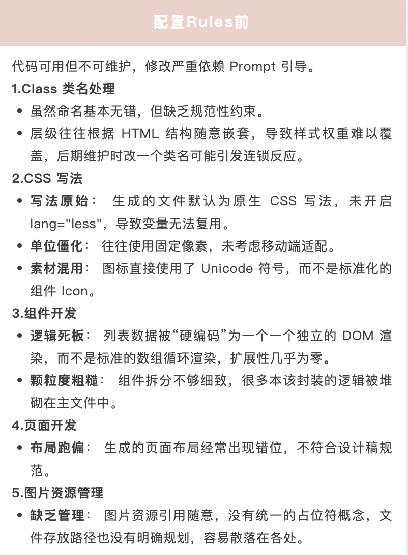 🌟再比如实际开发中,生成页面的任务使用了Rules后可以很快提交,能从5天压缩到3天,为什么会有这么快的速度呢?因为一些重复性较高的页面或者模块生成,我们不需要再重复提示大模型,这样就大大提效了。