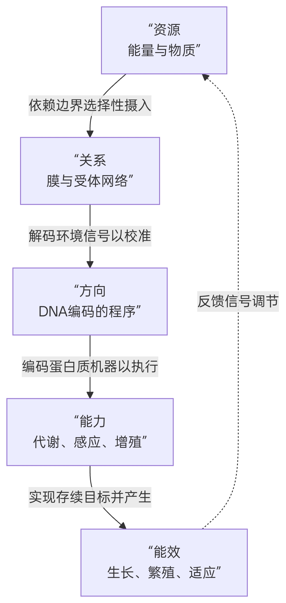 · 逼问结果:维持内部高度有序的“耗散结构”稳态。即,在持续与外界进行能量-物质交换的流动中,保持自身物理与化学模式的完整性与连续性。生存与复制是其存续驱动的终极表达。
