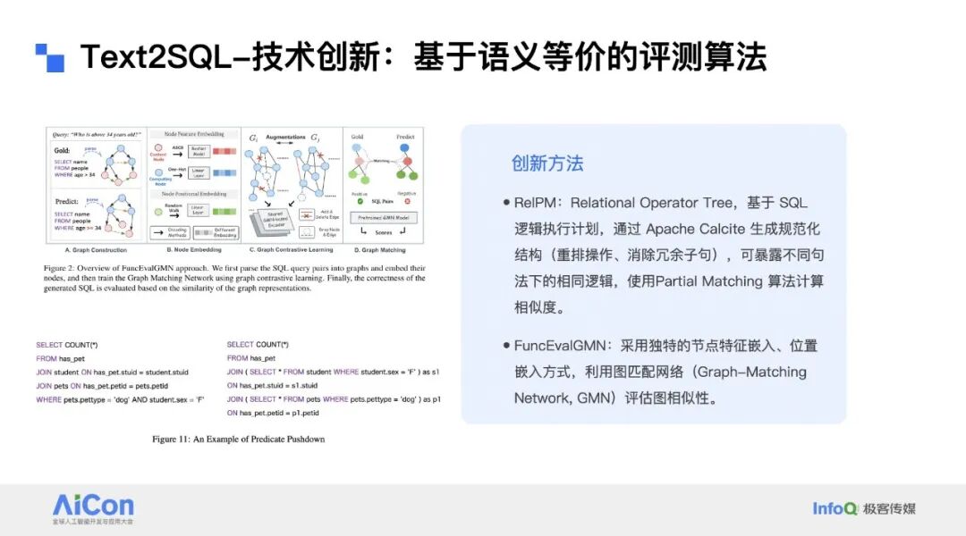 第二个方法,我们把节点之间的引用关系建立起来:参考答案是一张图,预测答案也是一张图,然后训练一个图匹配网络(Graph-Matching Network,GMN)来计算两条 SQL 在语法 / 表达上的相似度。基于语法树的匹配这一路,我们称为 RelPM(在执行层面的语法树上做 Partial Matching 的局部匹配):用规则做局部比对并赋权,得到 0~1 的相似度分数,已经明显优于传统做法。