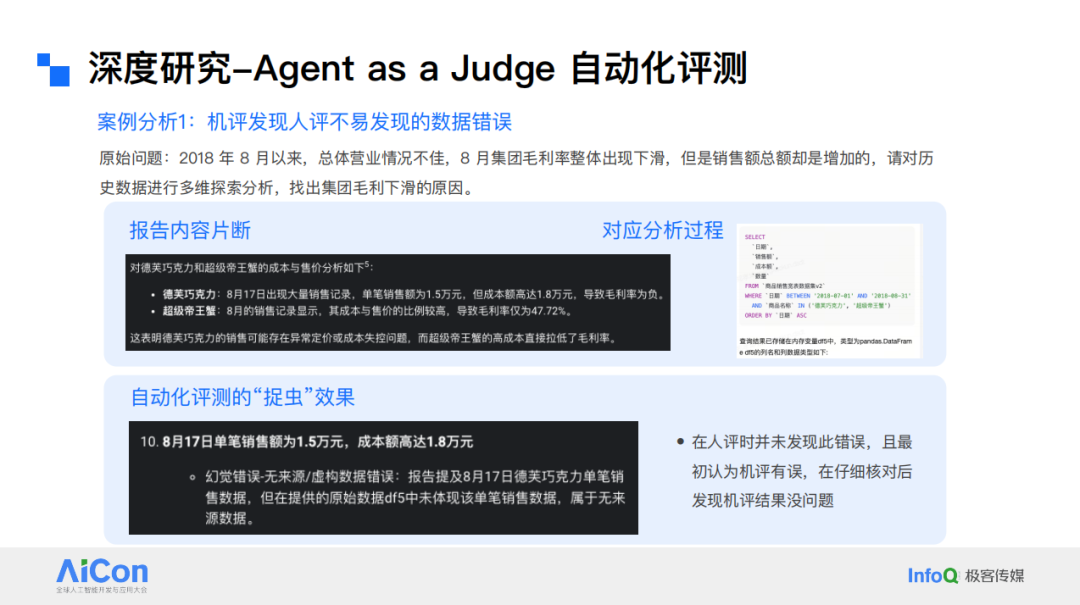 这是第一个案例:我们用自动化评测在报告里定位到数据错误。上面的片段是一个典型的归因场景。机评发现,报告写到“德芙巧克力单笔销售额 1.5 万”等数字没有真实来源。回溯过程可以看到,右侧的 SQL 少写了一个 GROUP BY 商品名。