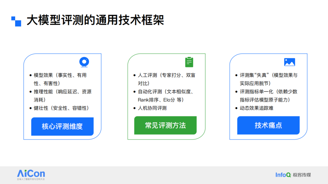 挑战主要体现在两方面:一是如何更加贴切地评价我们所构建应用的实际效果;二是既有的传统技术是否可复用,若不足,我们应在何处开展探索与创新。那当我们谈“模型评测”时,究竟在说什么、常见的评测维度和指标有哪些?