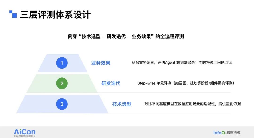 前面说的是数据领域里可能会遇到的问题。回到 Agent 这边,我们提出了一个“三层评测”的体系设计。在构建大模型的 Agent 应用时,通常会同时面对几层问题。