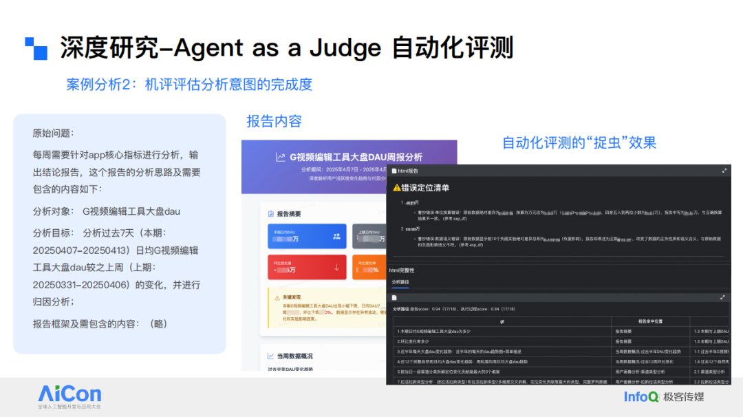 第二个例子,我们评估的是“分析意图的完成度”。左边是题目:对 DAU 数据做分析;下面先定义分析对象,再给出一套完整的分析框架,也就是要从哪些角度展开。右边是自动化评测页面的截图。红框里可以看到:这个题目一共有 18 个分析意图,这份报告完成了 17 个,对应得分 0.94。系统还会标注哪一个意图没有完成,已完成的意图在报告中对应的是哪些章节。由此能直观看到机评在这个场景下的实际效果。