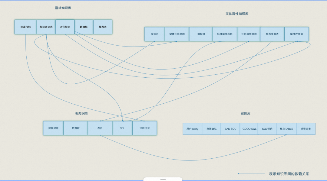 这些信息正好构成了书写SQL中必要信息,自然而然我们也分别构建指标(Metric Logic)/实体(Entity)/属性(Attribute)/表(Table)/字段(Columns)等知识库。