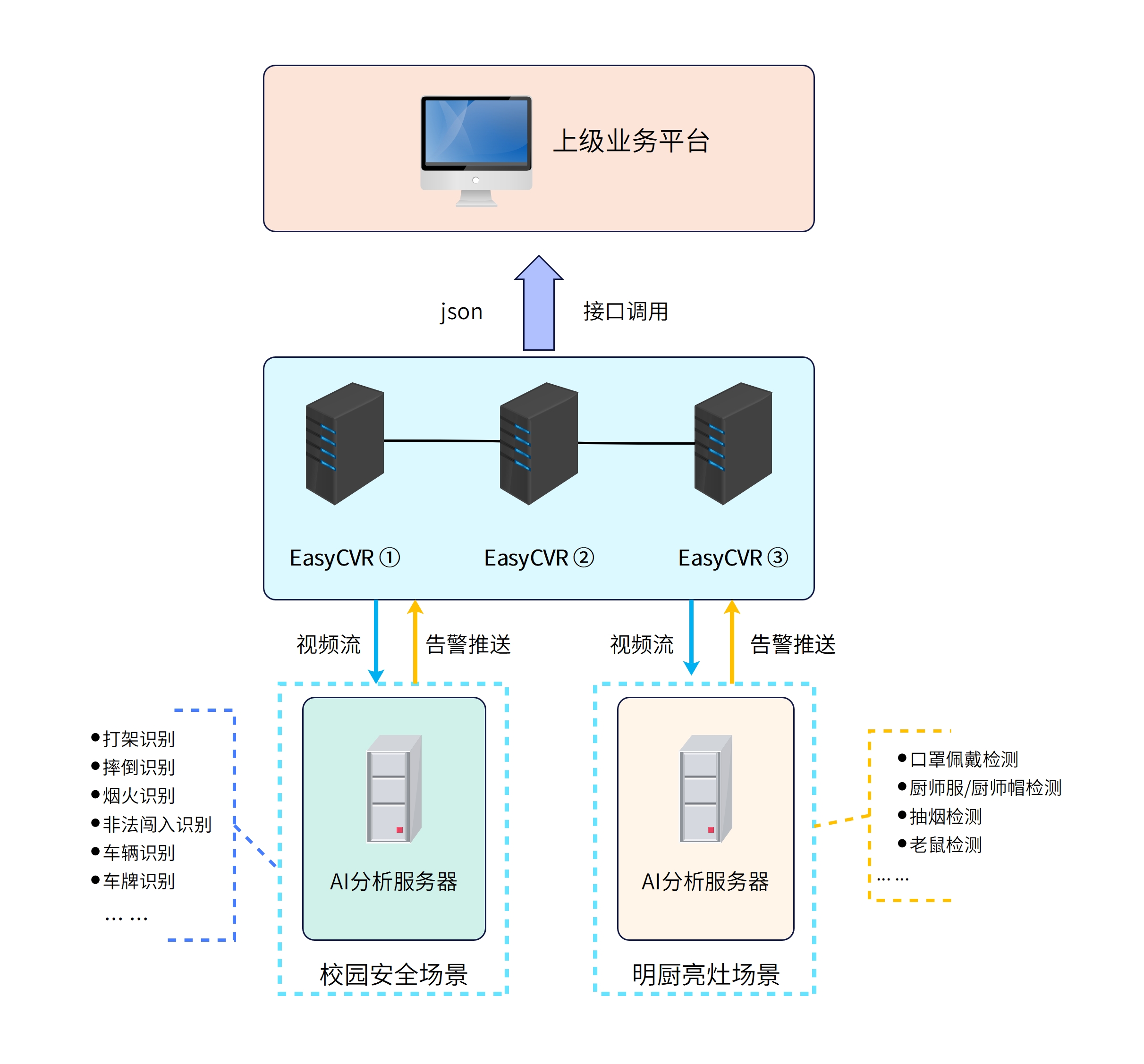 最近接到一个智慧校园的项目,感触挺深——用户这边光是监控设备就有近千路,覆盖教学楼、操场、食堂、围墙等所有核心区域,需求很明确:一方面需满足海量设备接入后的高并发稳定运行需求,另一方面需针对不同场景实现精准智能分析,且明确规划分两期推进——一期重点落地“明厨亮灶”场景分析,二期拓展至“校园安防”全场景覆盖。