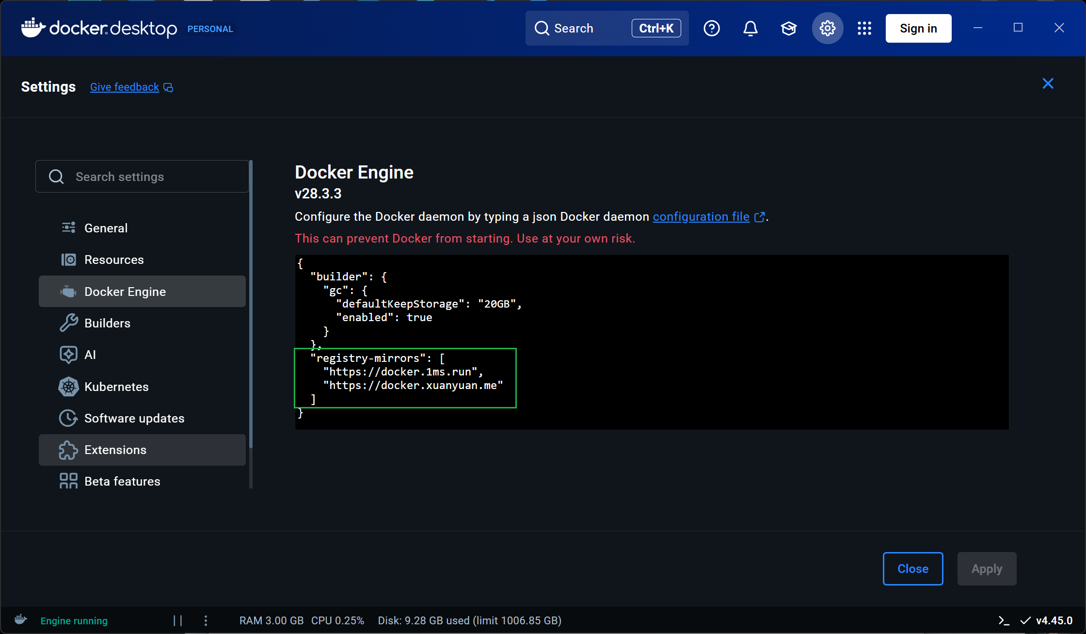 "registry-mirrors": [ "https://docker.1ms.run", "https://docker.xuanyuan.me" ]