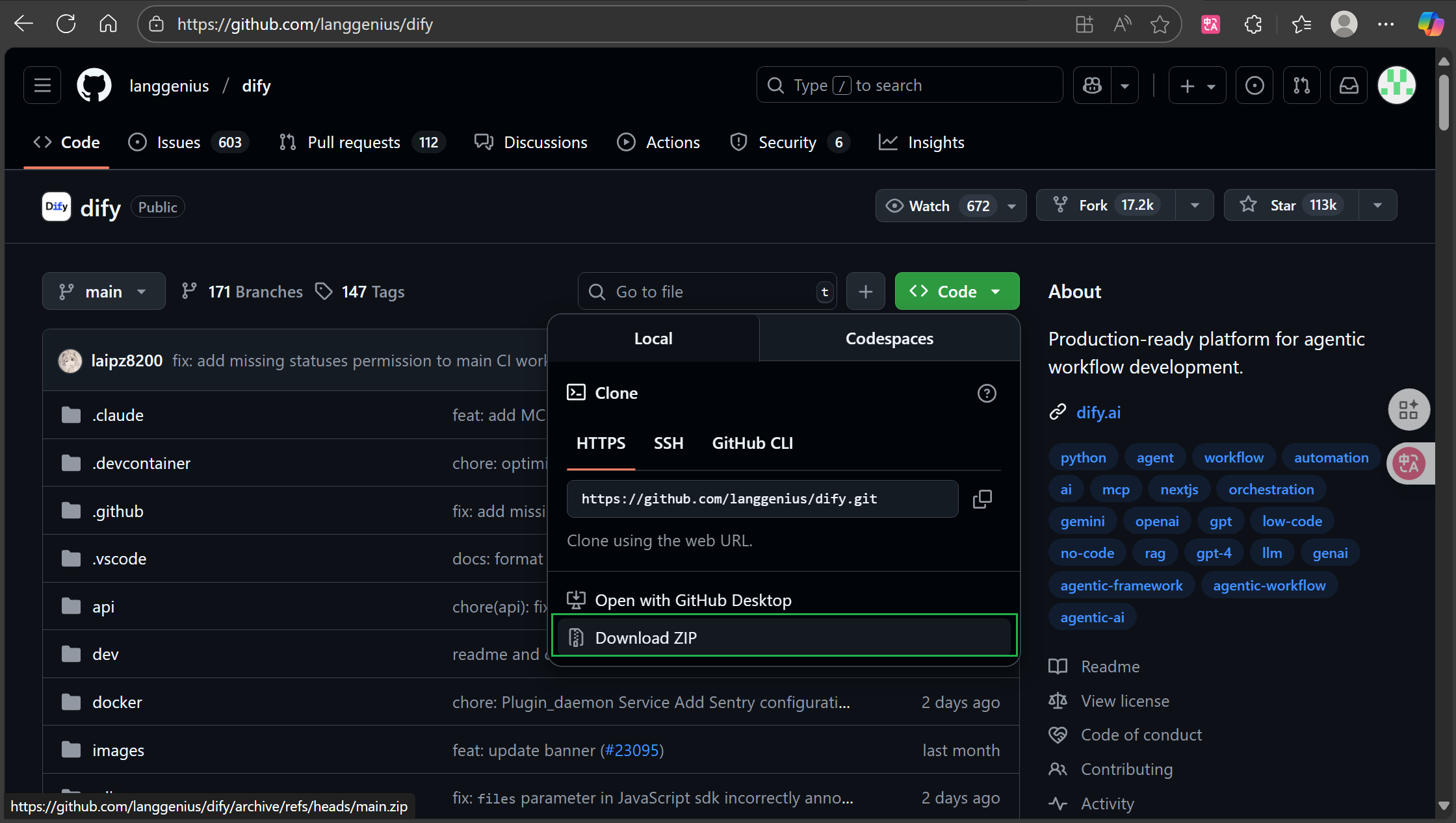 在Github中搜索Dify,找到Code中的Download ZIP
