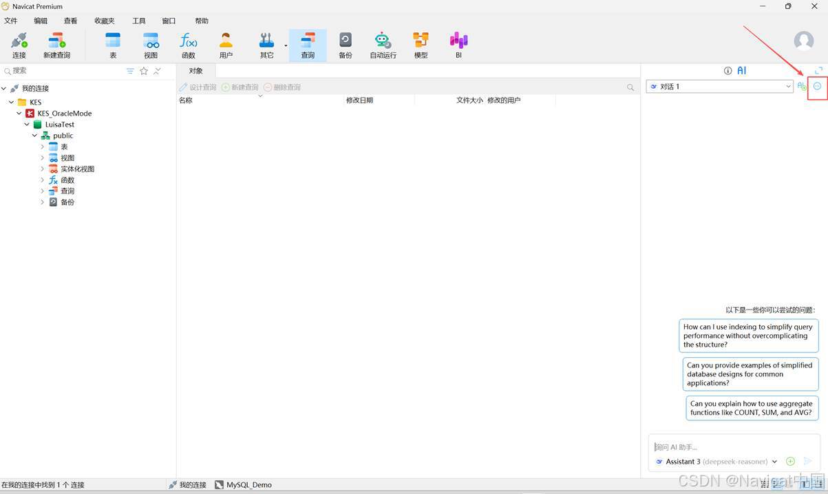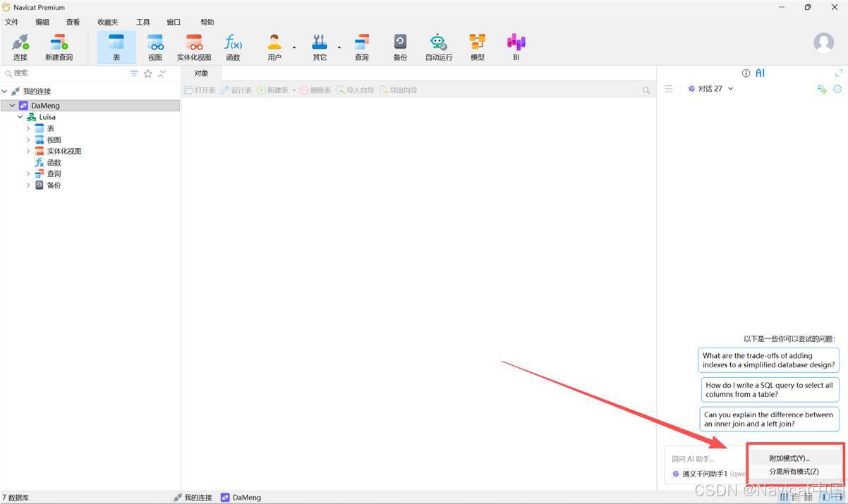 AI 助手是一个由人工智能(AI)驱动的生成式对话助手,可在用户使用自然语言处理技术编写查询时为其提供实时建议和指导。附加完模式后,点击输入框旁边的发送图标,将问题通过 AI 助手发送到 AI 提供商,并等待 AI 提供商将解答返回到 AI 对话中。输入完问题后,点击输入框旁边的加号,选择“附加模式”并勾选所需附加的模式,或者,若你希望移除已附加的模式,则选择“分离所有模式”新建 AI 对话后,在