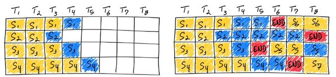 - 死板的批处理(Static Batching):为了提高 GPU 利用率,通常会将多个请求组成一个 Batch 一起处理。但在传统方法中,一个 Batch 里的所有序列必须步调一致。如果某个序列提前生成完了,它占用的资源(包括 KV Cache 内存)并不能立刻释放给新的请求,必须等待整个 Batch 中 最慢 的那个序列完成。seq1 生成了 2 个 token,3 生成了 1 个,4 生成了 2 个,然而 2 生成了 5 个,seq1、3、4 结束标记后的白色方块就是GPU在空闲,什么都没有做,此时GPU利用率非常低,传统的 static batching 不能把白色空闲时间利用起来。