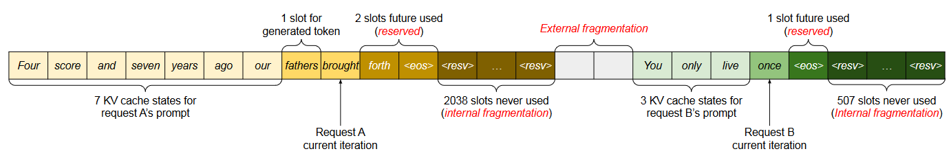 - 预先分配(Pre-allocation):为每个请求序列预先分配一块连续的内存空间,大小通常是按照该请求可能达到的最大序列长度来计算的。如果一个请求只需要生成很短的序列,那么大部分预分配的空间就被浪费了。