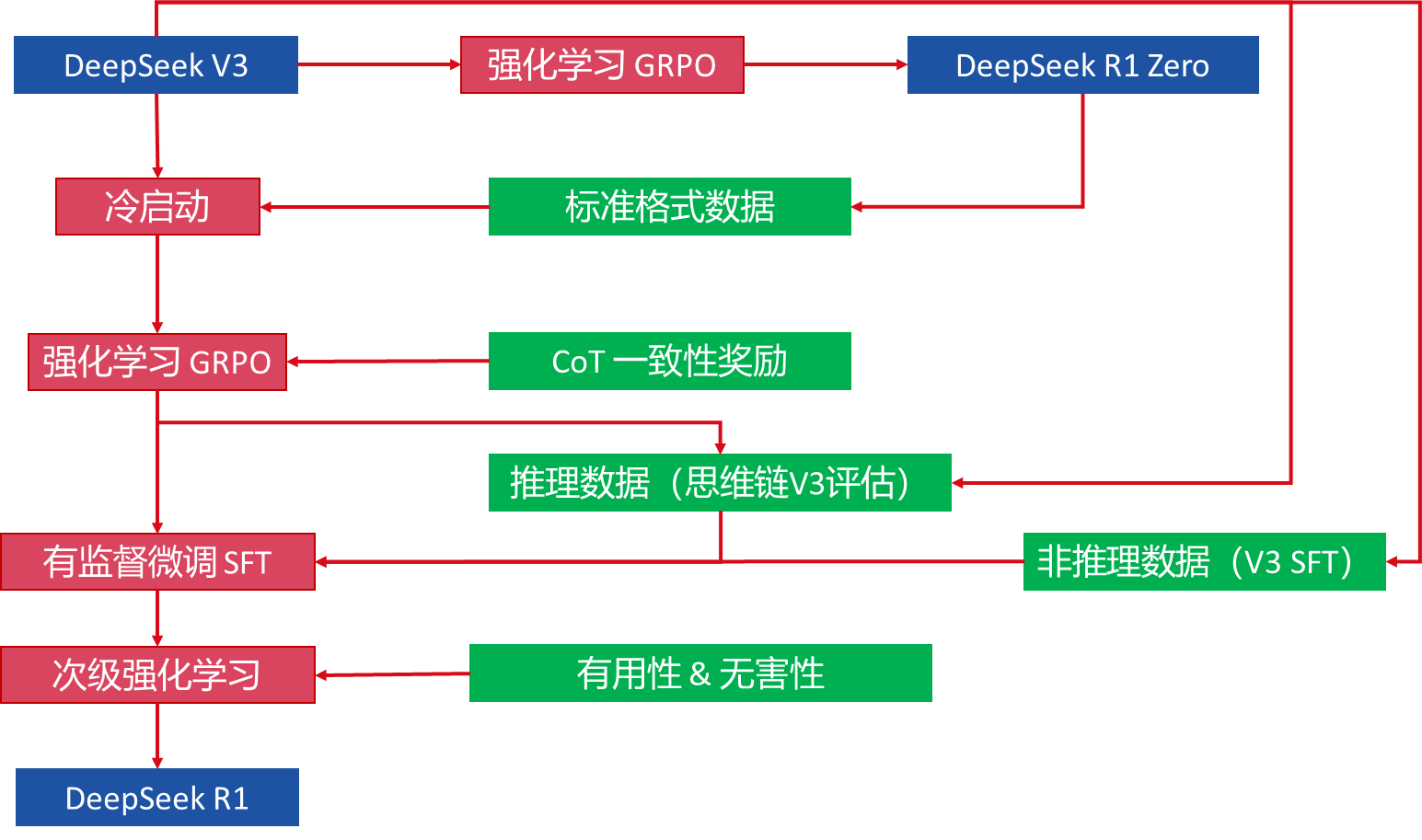 【阶段 3:推理能力蒸馏与监督微调】利用 R1-Zero 生成的大量高质量推理样本,对模型进行蒸馏式 SFT。该阶段保留强化学习获得的推理能力,同时显著改善输出稳定性、可控性和通用可用性,形成正式的 DeepSeek R1。
