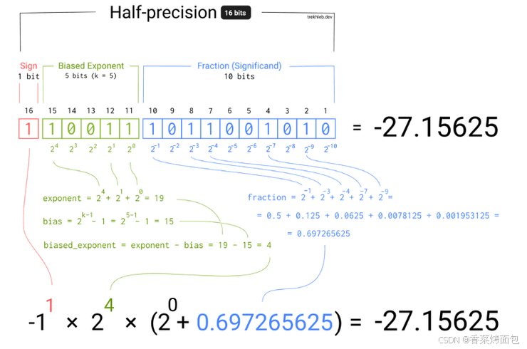 FP16 表示16位浮点数,通常为IEEE 754定义的半精度二进制浮点格式,由1位符号位、5位指数位和10位尾数位组成: