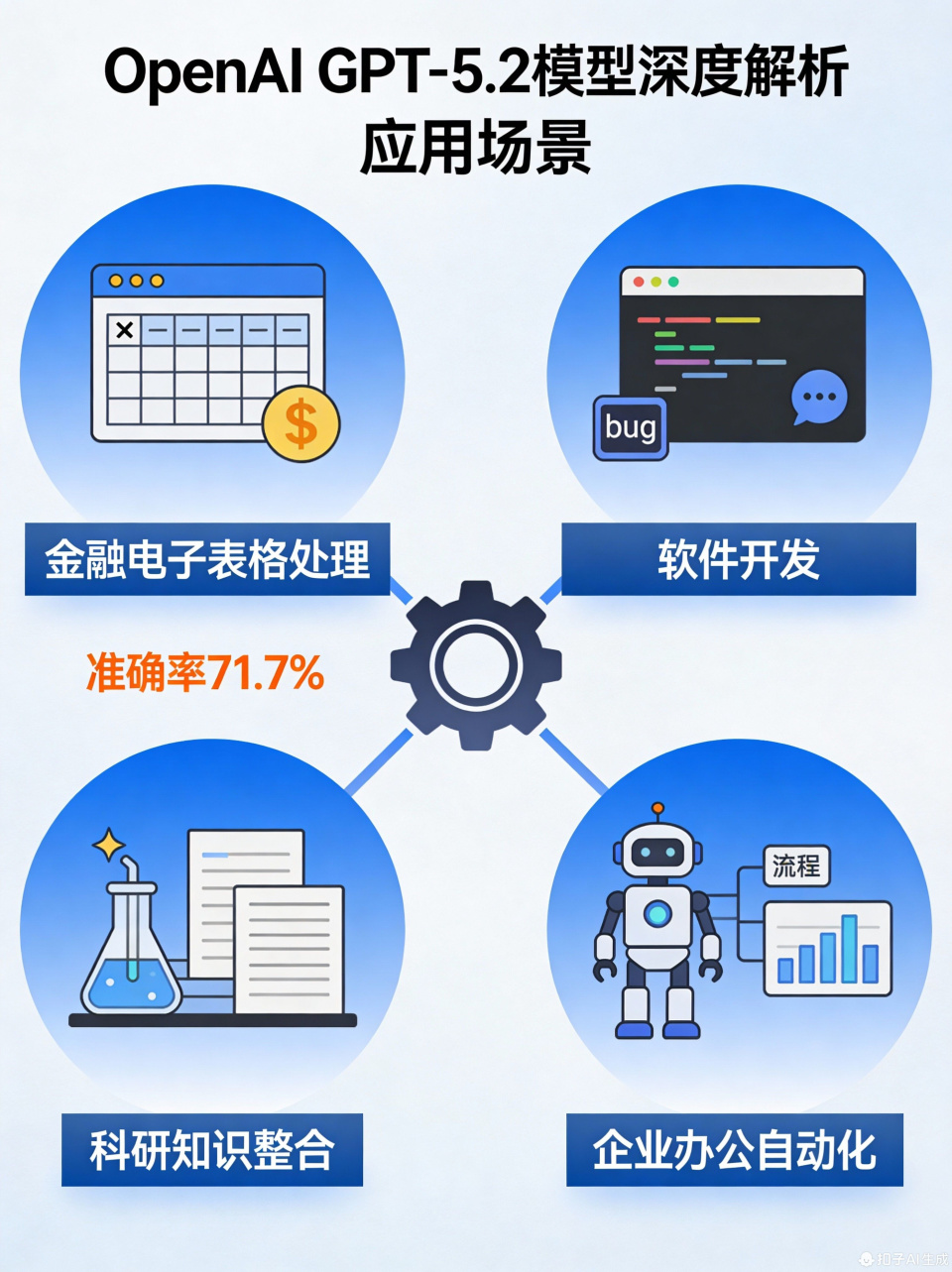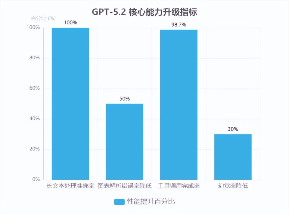 在金融分析场景中,GPT-5.2 针对投资银行电子表格任务展现出显著优势。其 Pro 版本在内部测试中准确率达到 71.7%,Thinking 版本为 68.4%,该性能已接近或超过行业专家水平,尤其适用于金融建模、预测及数据分析等需要高精度数学推理的任务。技术支撑方面,模型的视觉处理能力实现关键突破——图表推理与软件界面理解错误率较前代降低约 50%,可精准解读数据仪表盘与复杂可视化报告,直接提升电子表格生成与校验的效率。