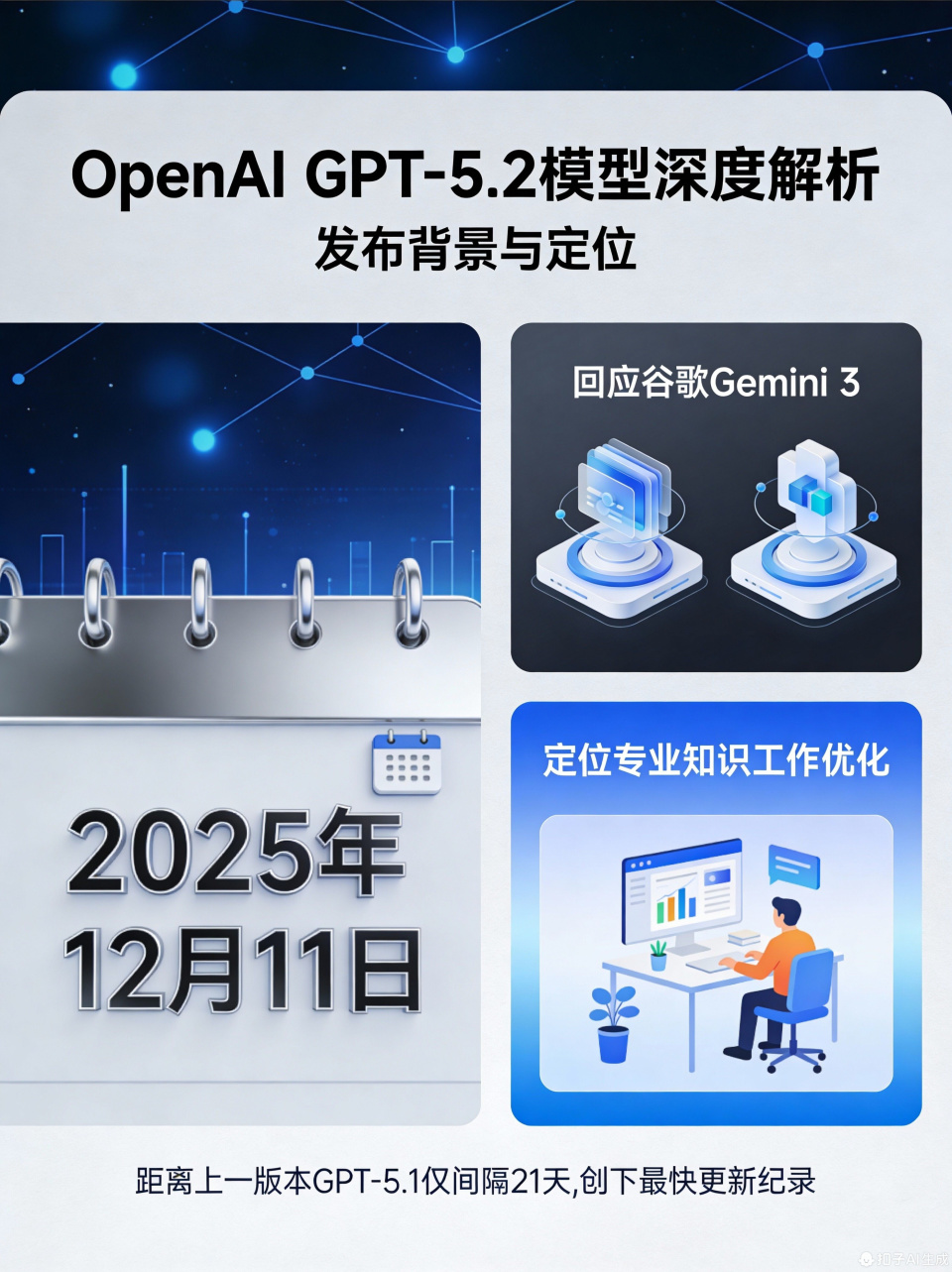 生成式AI领域正经历激烈的技术竞速,OpenAI于2025年12月11日正式发布GPT-5.2,这是对谷歌11月推出的Gemini 3模型的战略回应。面对Gemini 3在多模态处理与长文本理解上的突破,OpenAI CEO Sam Altman启动"红色警报"机制,将资源集中于核心模型迭代,使得GPT-5.2距上一版本GPT-5.1发布仅间隔21天,创下该公司历史上最快更新纪录。
