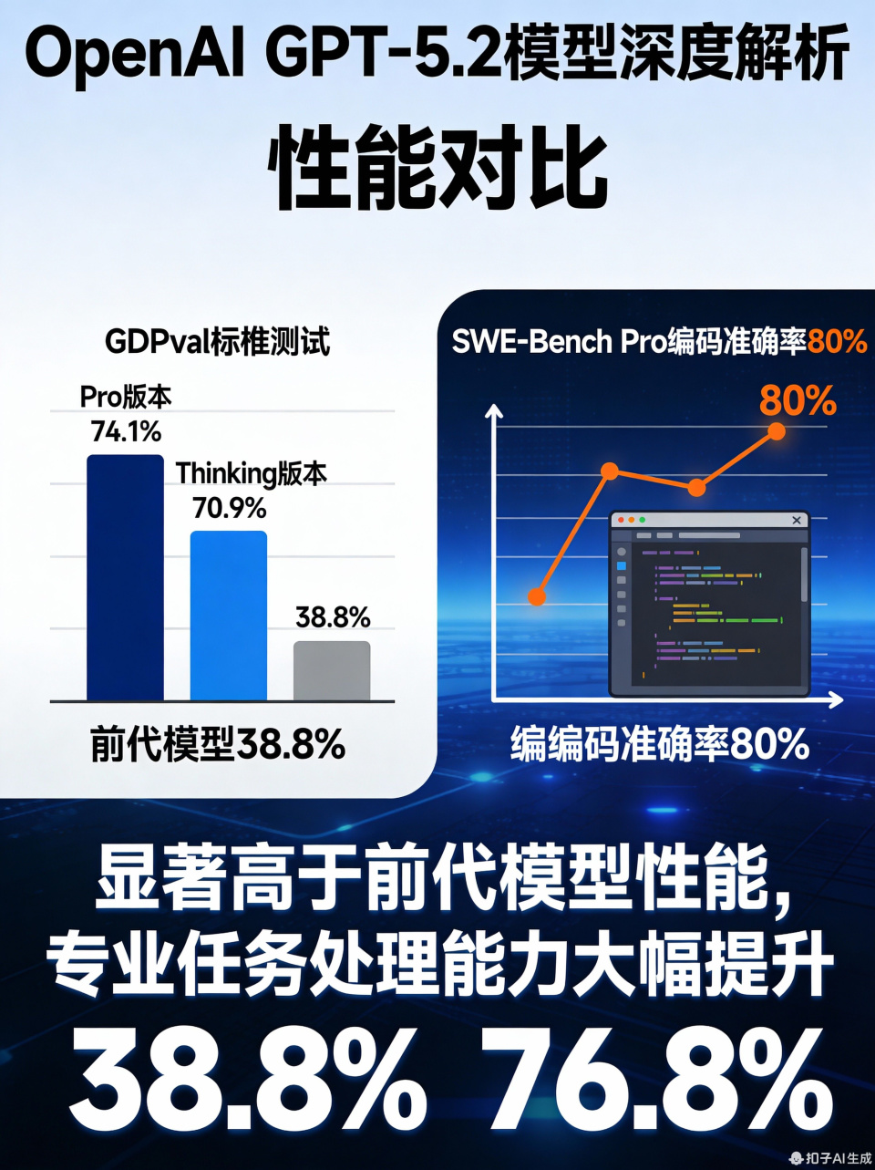 GPT-5.2系列在核心基准测试中呈现显著版本差异。GDPval基准作为衡量AI职业任务能力的关键指标,涵盖44种知识型工作场景(如金融分析、法律文书、工程设计等),Pro版本以74.1%的综合表现(允许平局时胜或平)领先,Thinking版本紧随其后达70.9%。在专业领域细分中,投资银行电子表格任务处理准确率达71.7%(Pro版本),编码领域的SWE-Bench Pro测试准确率达80%,验证了模型在结构化任务中的高精度表现。